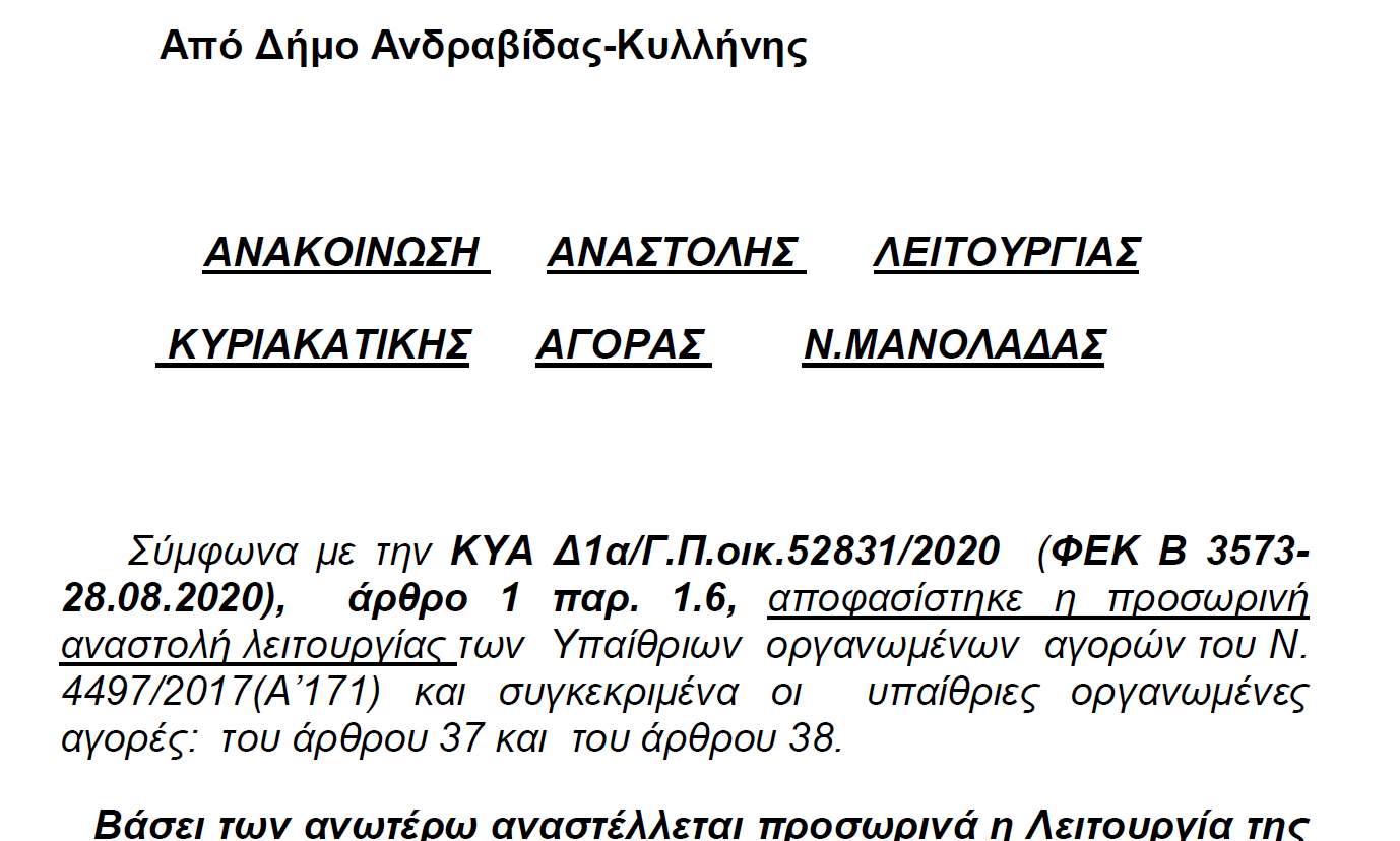Βάσει των ανωτέρω αναστέλλεται προσωρινά η Λειτουργία της Κυριακάτικης Αγοράς Ν.Μανολάδας , από 01/09/2020 έως και 15/09/2020